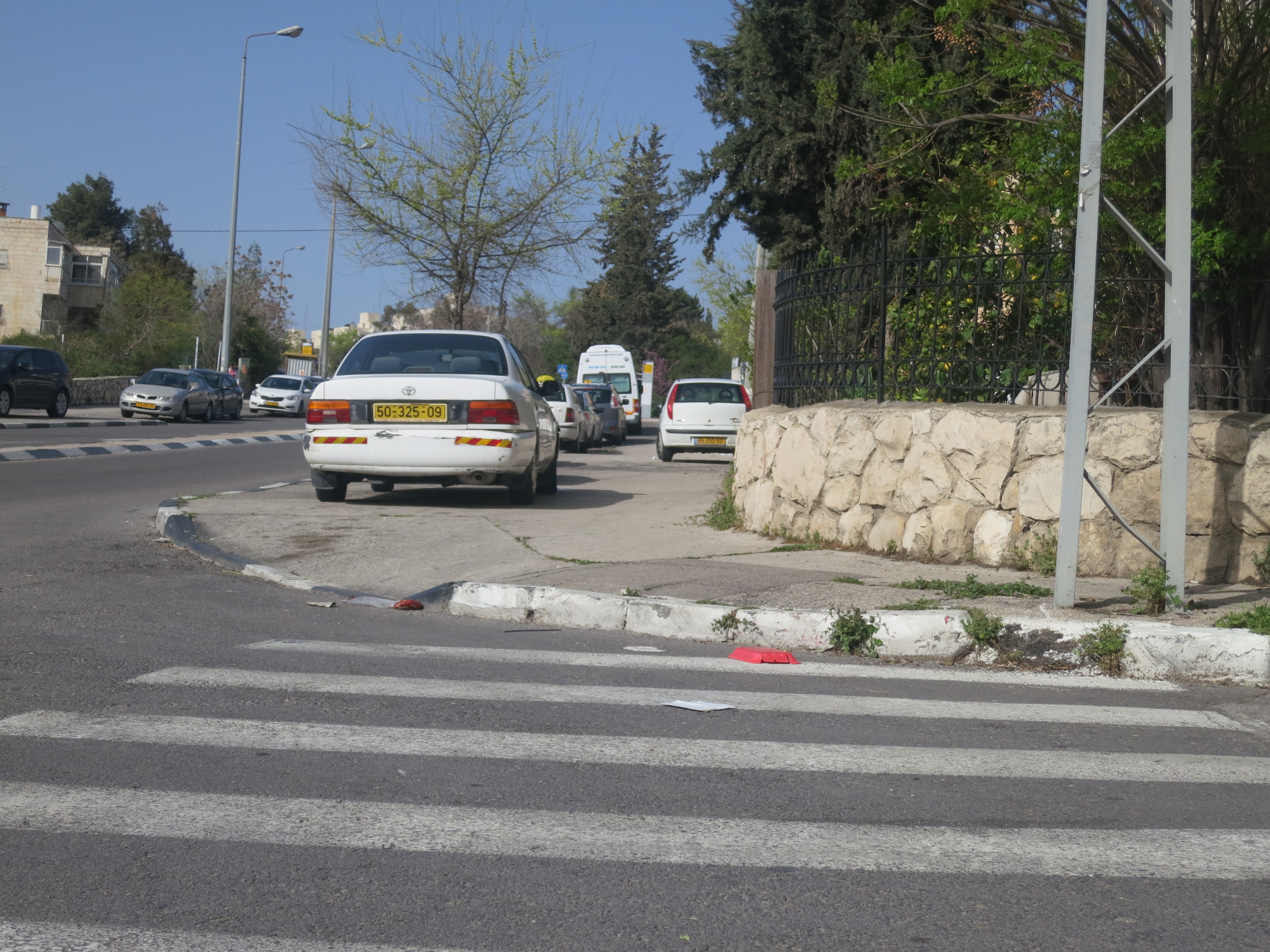 מי שניחן ביכולת הליכה עצמאית וראִייה, יכול להתגבר על מכשולים הניצבים פעמים רבות במדרכה (כמו מכונית שלא משאירה מקום למעבר או אוביקט החוסם את המדרכה באופן קבוע), על ידי חירוף נפשו וירידה לכביש. אך נכים בכסאות גלגלים, זקנים הנעזרים בהליכוֹן או עיוורים, למשל, נמצאים בבעיה גדולה ולמעשה בסכנת חיים מתמדת, כשהם מבקשים לנוע ברחוב. הנה תמונה מבוקרו של שושן פורים תשע"ד, שהיא למרבה הצער חזון נפרץ מאד במדרכות ירושלים. מי שחנה כך והשאיר 50-40 ס"מ למעבר הולכי הרגל אולי לא התכוון לרע, אך קרוב לודאי מדחיק את העובדה שהוא אחראי לסיכון חייו של הנכים, העיוורים והולכי הרגל שיאלצו לרדת בגללו לכביש.