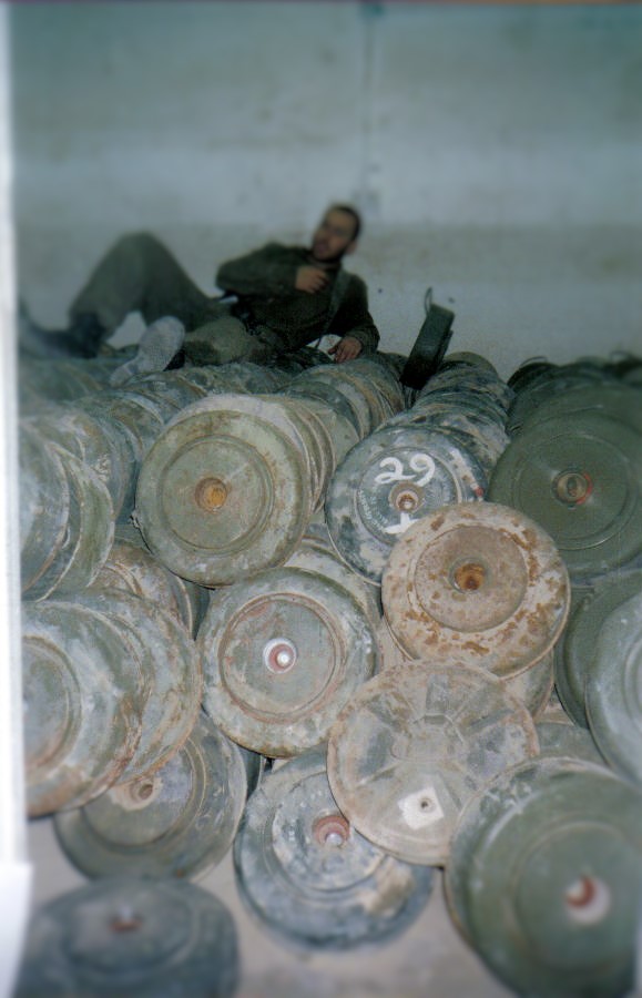החל משבוע לפני הפינוי, היה החדר שלידו ישנּוּ מאוכלס במאות המוקשים שהועלו למוצב בשביל לפוצץ אותו ברגע הפינוי. המחשבה שאנחנו ישנים ליד ערימת חומר נפץ כזו כנראה לא הטרידה אותנו, או שאולי בכל זאת היתה בנו משהו מהאפָּטיוּת המתוארת בסרט 'בופור'. כפי שאפשר לראות בתמונה, היו שהצטלמו למזכרת על מוקשי הנ"ט (נגד טנקים) הללו. היה זה צעד לא נבון במיוחד, שבוצע, אולי, מתוך תחושת מורבידיות קולקטיבית מסוימת. להגנתם יאמר שמוקשי נ"ט לא אמורים להיות מופעלים על ידי משקל אדם. בכל אופן, המוקשים האלה הבהירו לכולנו ששמונה-עשרה השנים של השהות הצה"לית בבופור באמת הולכות להגמר, גם אם עדיין לא ידענו את העיתוי המדויק.